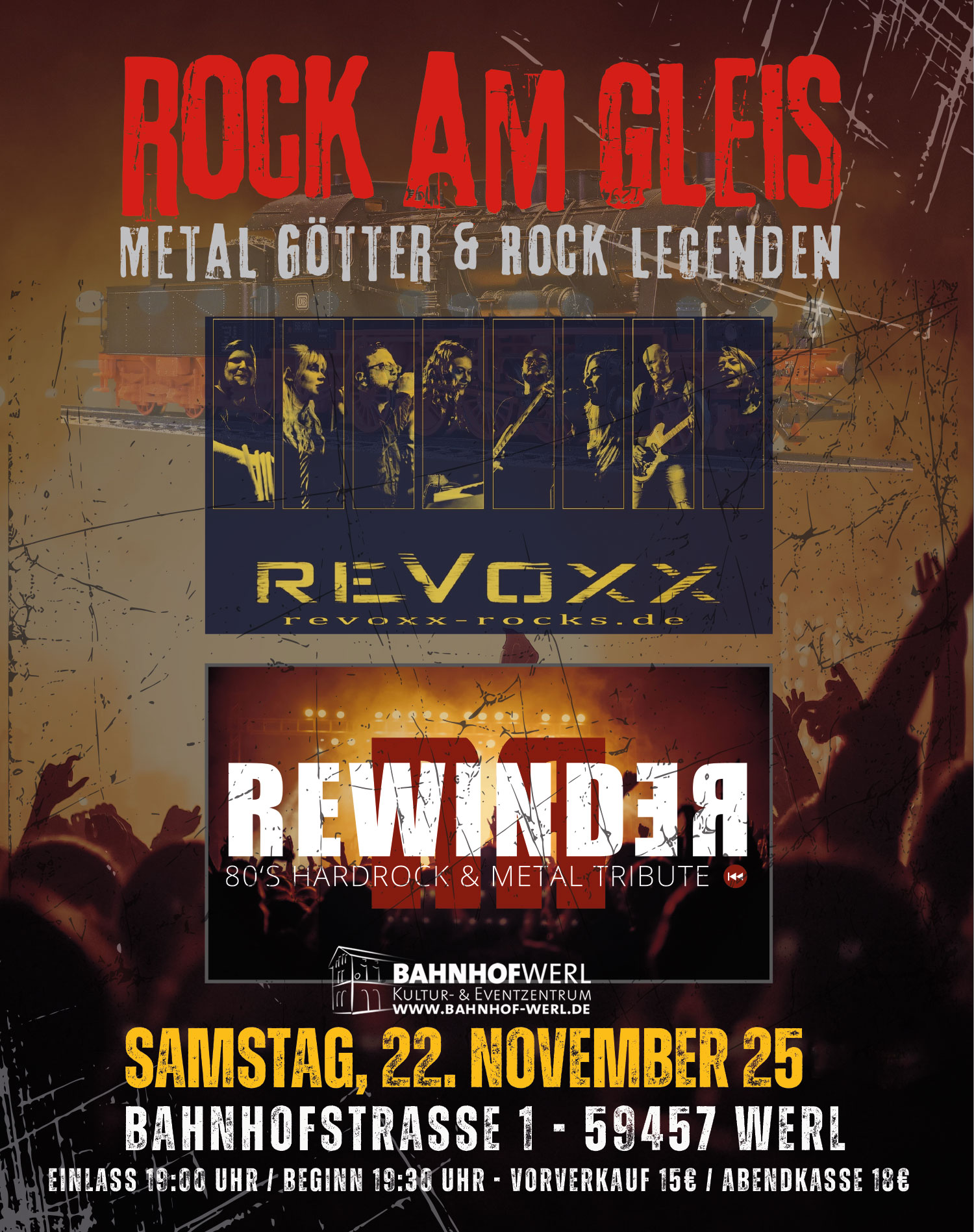 Weiter geht es im November mit ROCK am GLEIS am Samstag, 22.11., mit gleich zwei hervorragenden Cover- und Tribute-Bands (reVoxx und Rewinder). Mehr Infos dazu und wie es im November und Dezember weitergeht, finden sich hier...