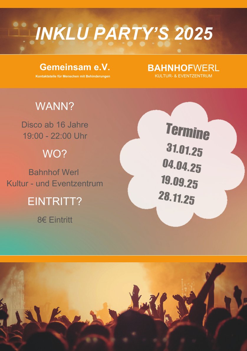 Die Party für Menschen mit und ohne Behinderung. Mit barrierefreiem Zugang! Zutritt erhält man ab einem Alter von 16 Jahren.