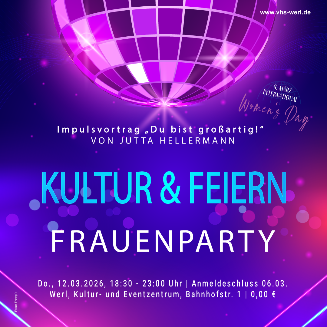 Außerdem präsentieren die Gleichstellungsstelle der Wallfahrtsstadt Werl und die Werler Soroptimistinnen in Zusammenarbeit mit der Volkshochschule Werl - Wickede (Ruhr) - Ense anlässlich des Internationalen Frauentages 2026 im Rahmen des Frauenmärzes 2026 unter dem Titel "Kultur & Feiern" einen Impulsvortrag von Jutta Hellermann mit anschließender Frauenparty (Do. 12.03.). Anmeldeschluss ist Fr. 06.03.!