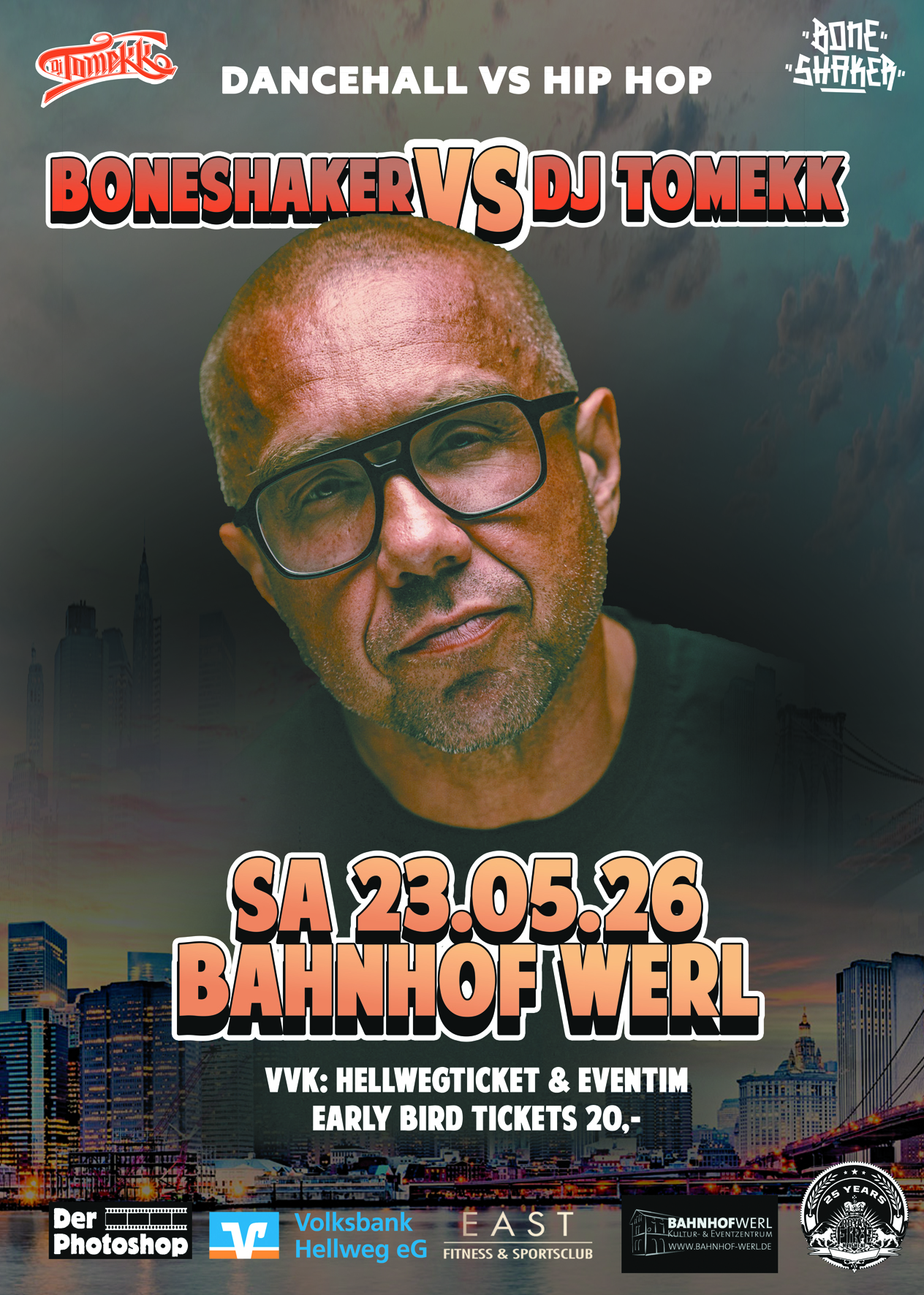 Dancehall vs Hip Hop! Ein besonderer Abend wirft seine Schatten voraus: Eingeladen vom Boneshaker Soundsystem kommt Mit DJ Tomekk eine prägende Figur des deutschen Hip-Hops nach Werl. Anlass sind gleich mehrere Jubiläen und eine Veröffentlichung, die den Abend zusätzlich besonders macht.