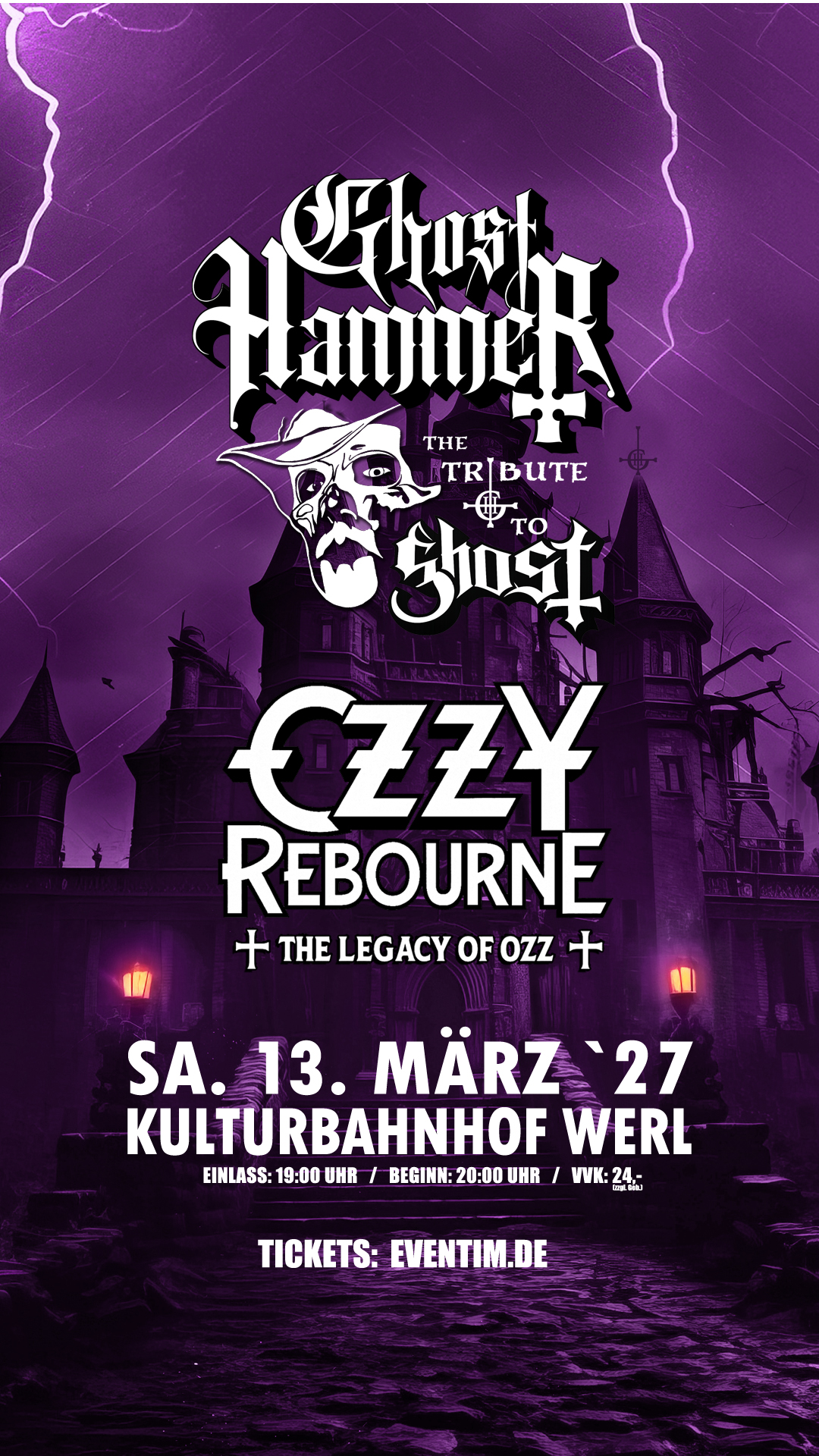 Am Samstag, den 13. März 2027 wird der Kulturbahnhof Werl zum Wallfahrtsort für alle Fans des gepflegten Hard- und Heavy-Sounds: Zwei außergewöhnliche Tribute-Acts treffen auf einer Bühne aufeinander – Ozzy Rebourne und Ghost Hammer. Ein Abend, der nicht nur Nostalgie entfacht, sondern die musikalische Magie zweier Ikonen des modernen Rock neu aufleben lässt.