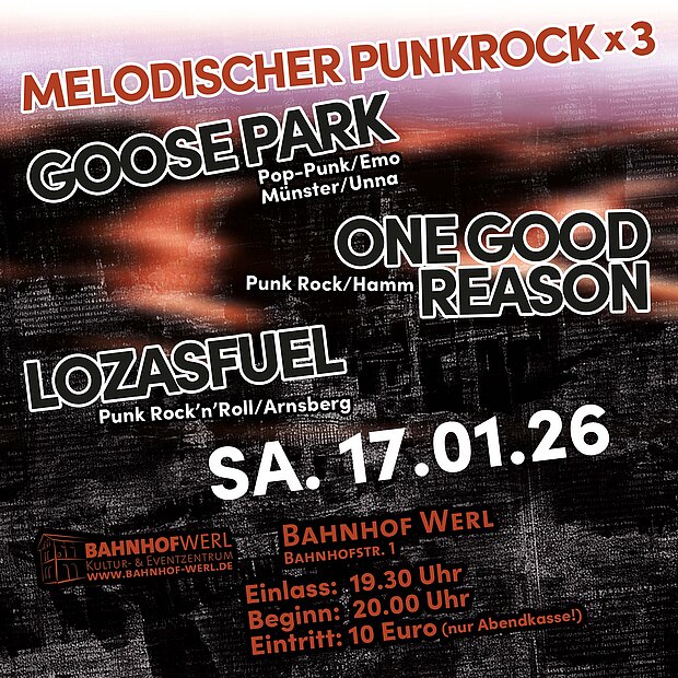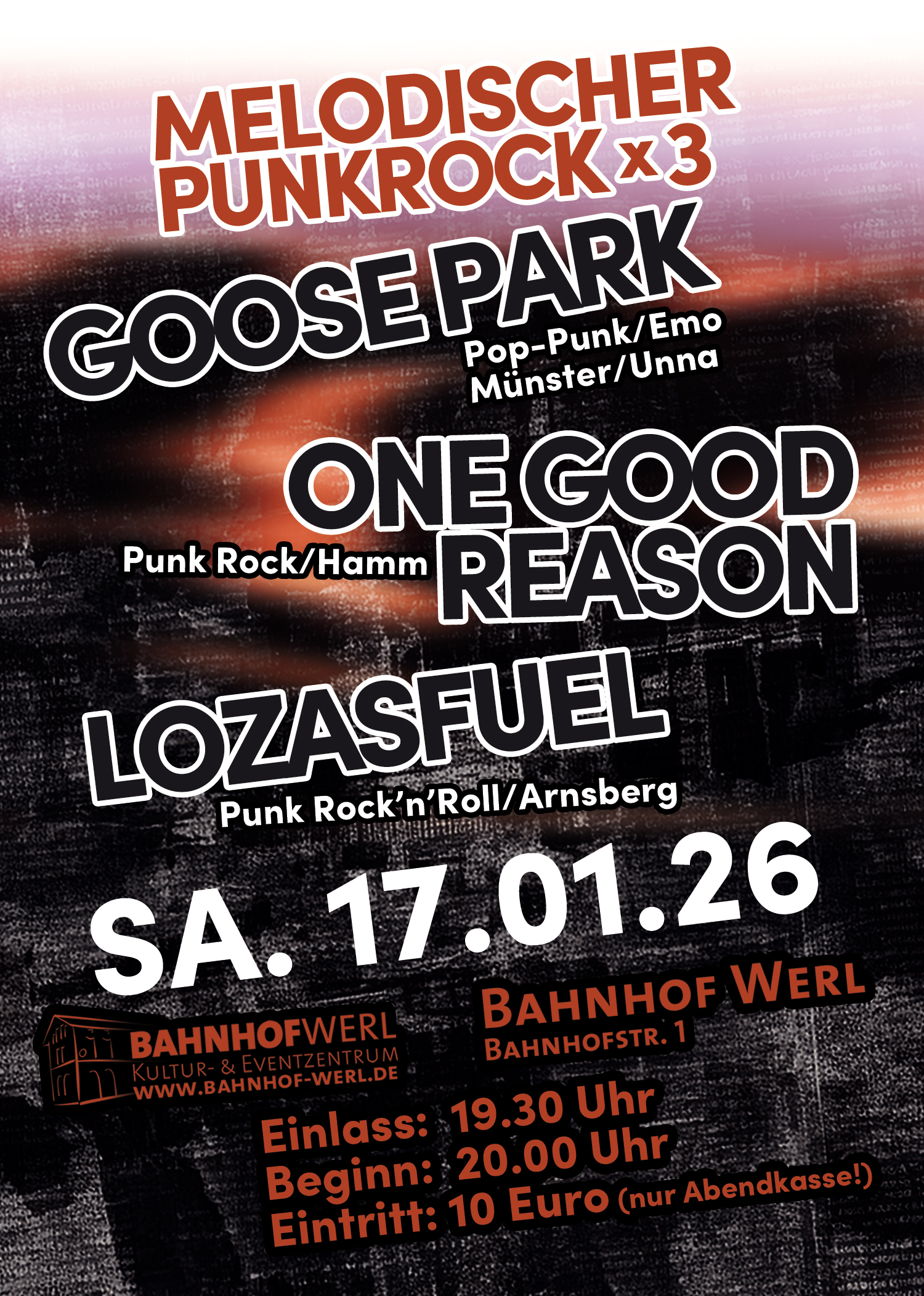 Am Samstag, 17. Januar, gibt es im Werler Bahnhof zu Jahresbeginn gleich 3 x melodischen Punkrock mit den Bands Goose Park, One Good Reason und Lozasfuel live.